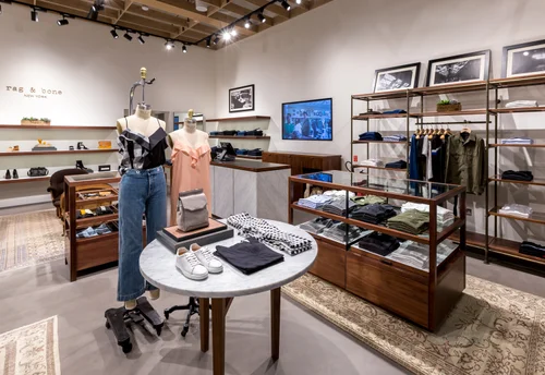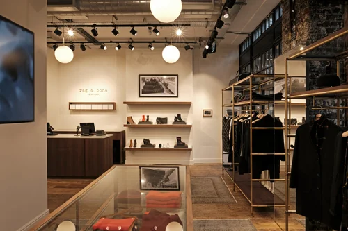 In keeping with tradition, the interior design evokes the brand's downtown New York DNA and a modern, industrial aesthetic. Aged oak floors and exposed brick columns from the original build are juxtaposed with contemporary, specialty furnishings designed by the rag & bone in-house Custom Fabrication shop, including brass and walnut display units and modern white shelving with interior lighting.